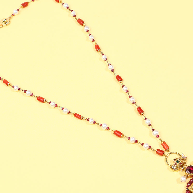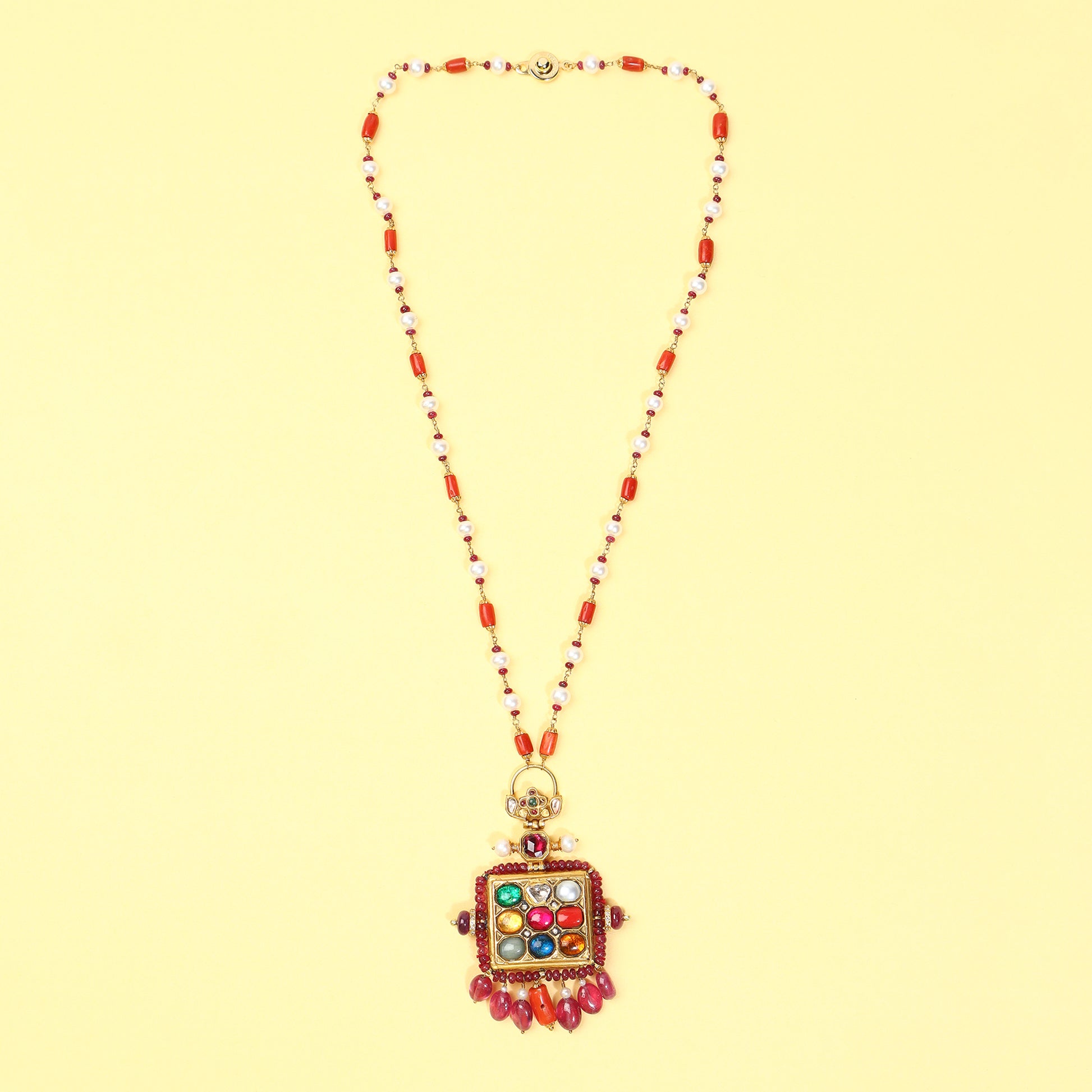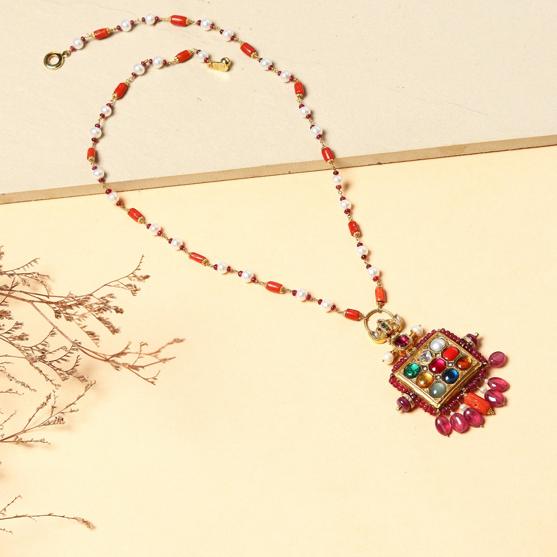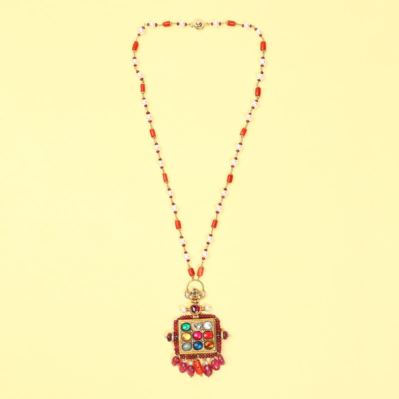 Gold 14, 18 & 24 cts, 6.20 gms, Polki 0.25 cts, Rubies 35 cts, Diamonds 0.30 cts, Corals 20 cts, Pearls 35 cts, Assorted Navratan Gems 7.0 cts