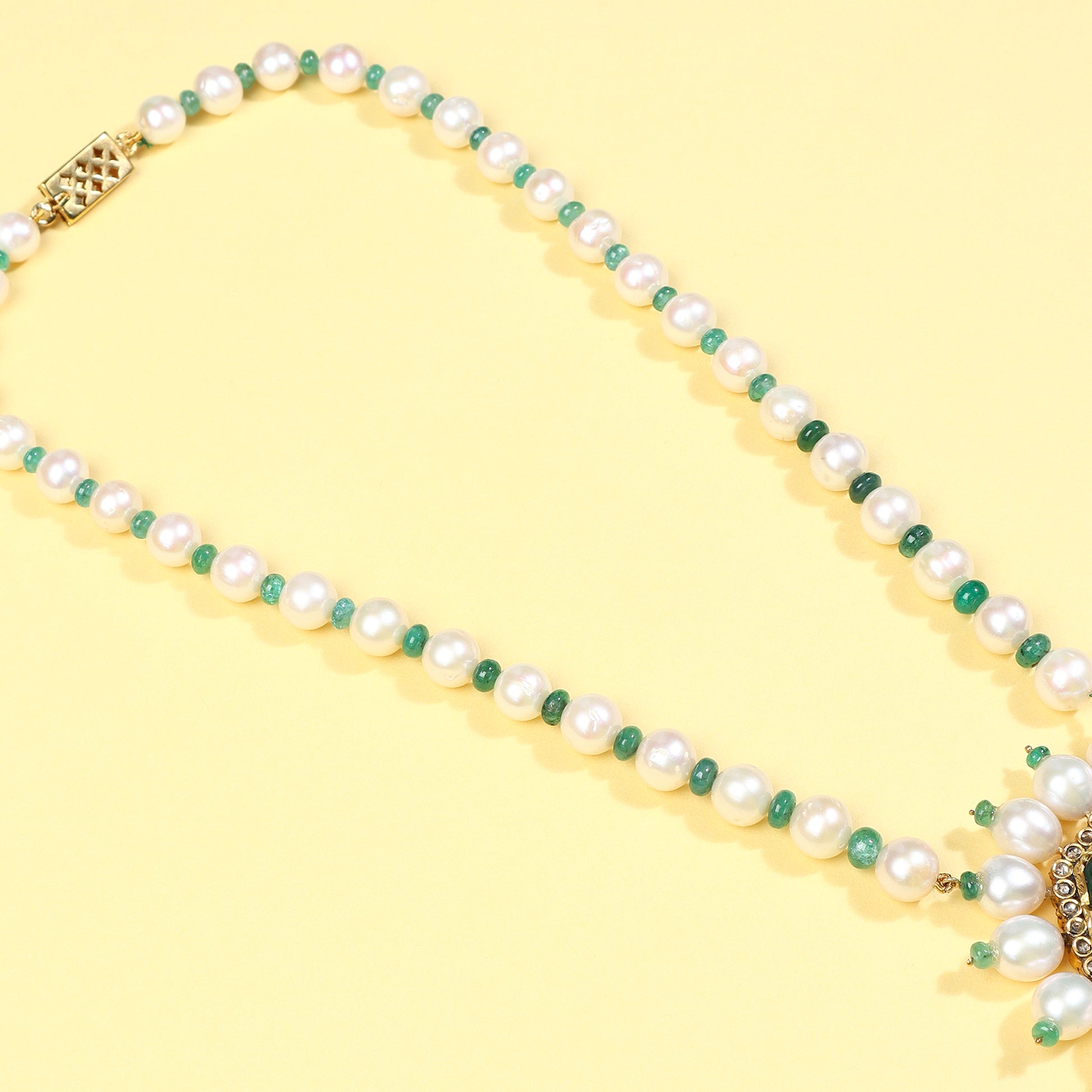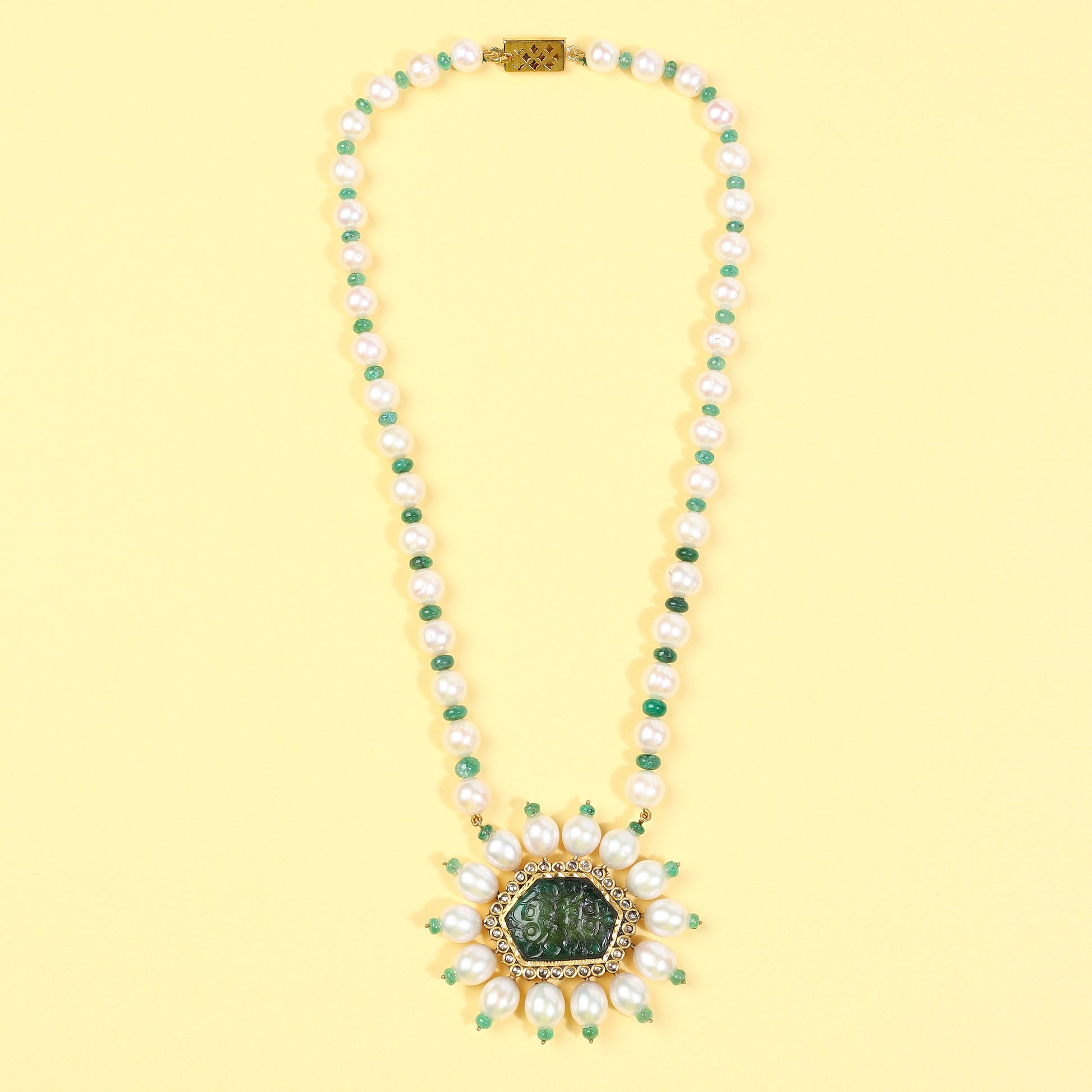 Gold 18 & 24 cts 7.9 gms, Polki 1.50 cts,Emeralds 59 cts, Pearls 320 cts