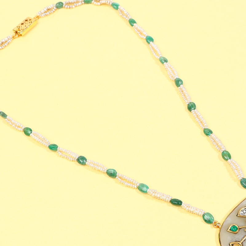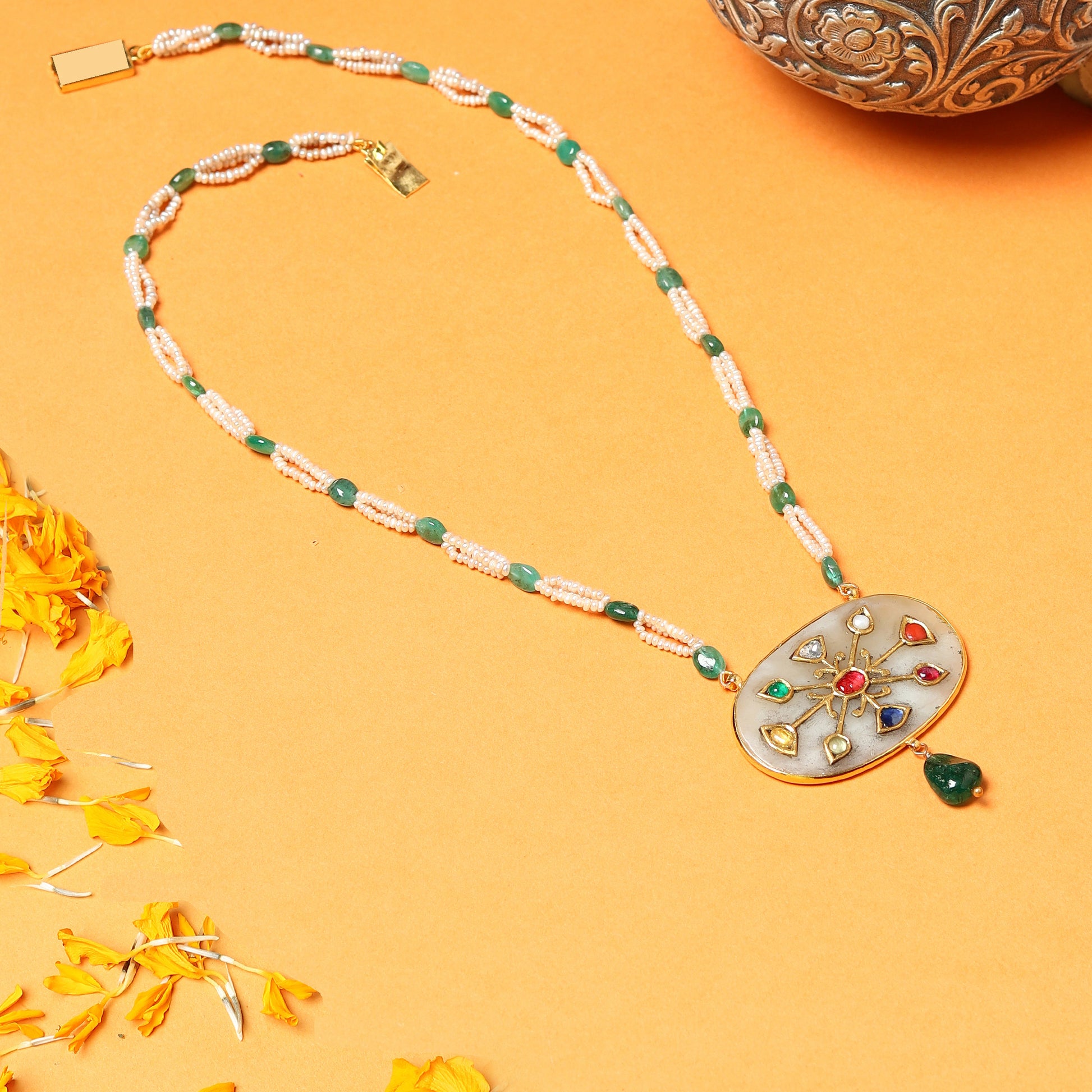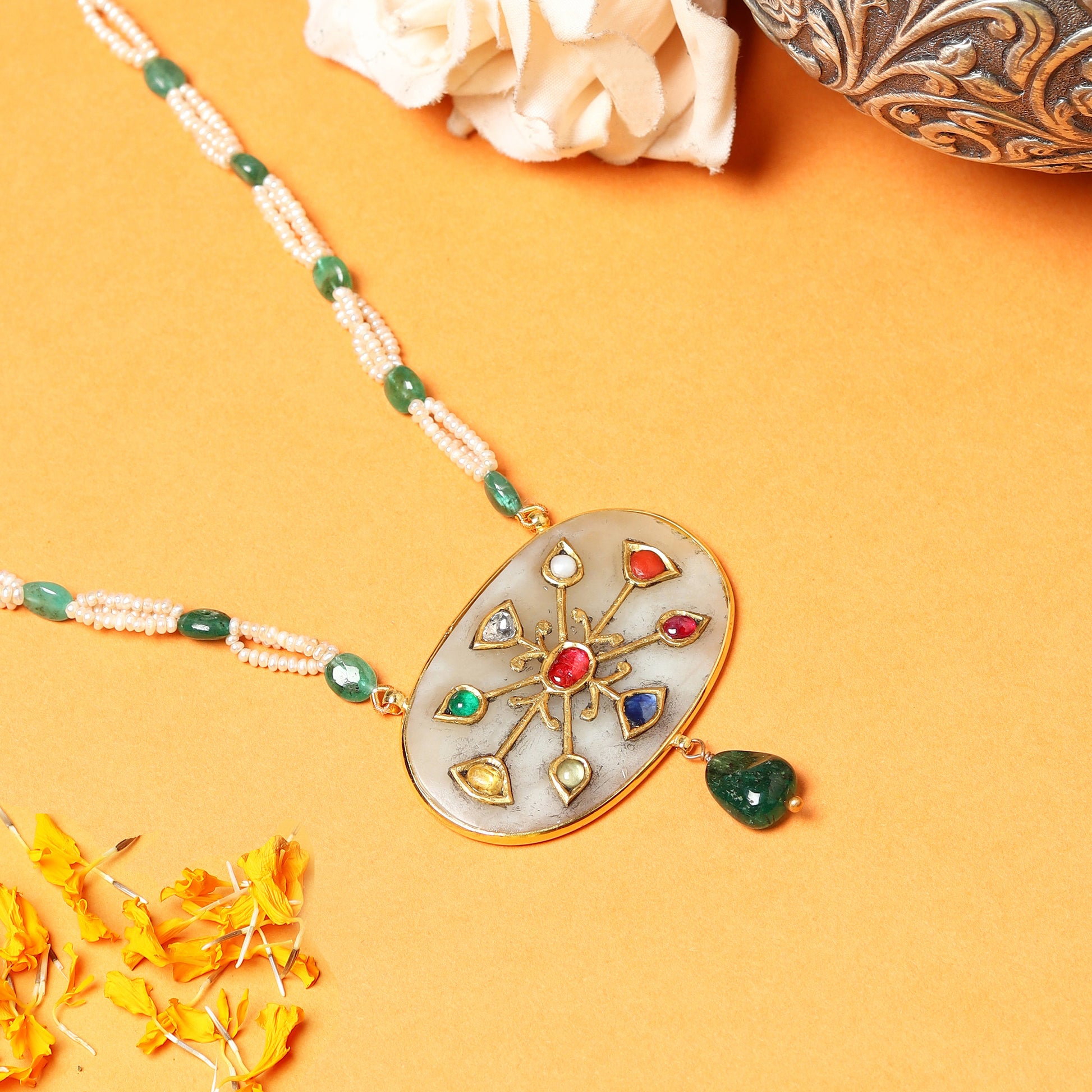 Gold 14 & 24 ct 4.20 gms, Jade 39 cts, Polki 0.10 cts, Emeralds 14.5 cts, Pearls 34.65 cts, Assorted Navratan Gems 1.90 cts