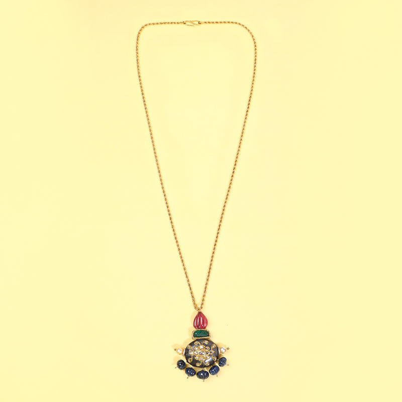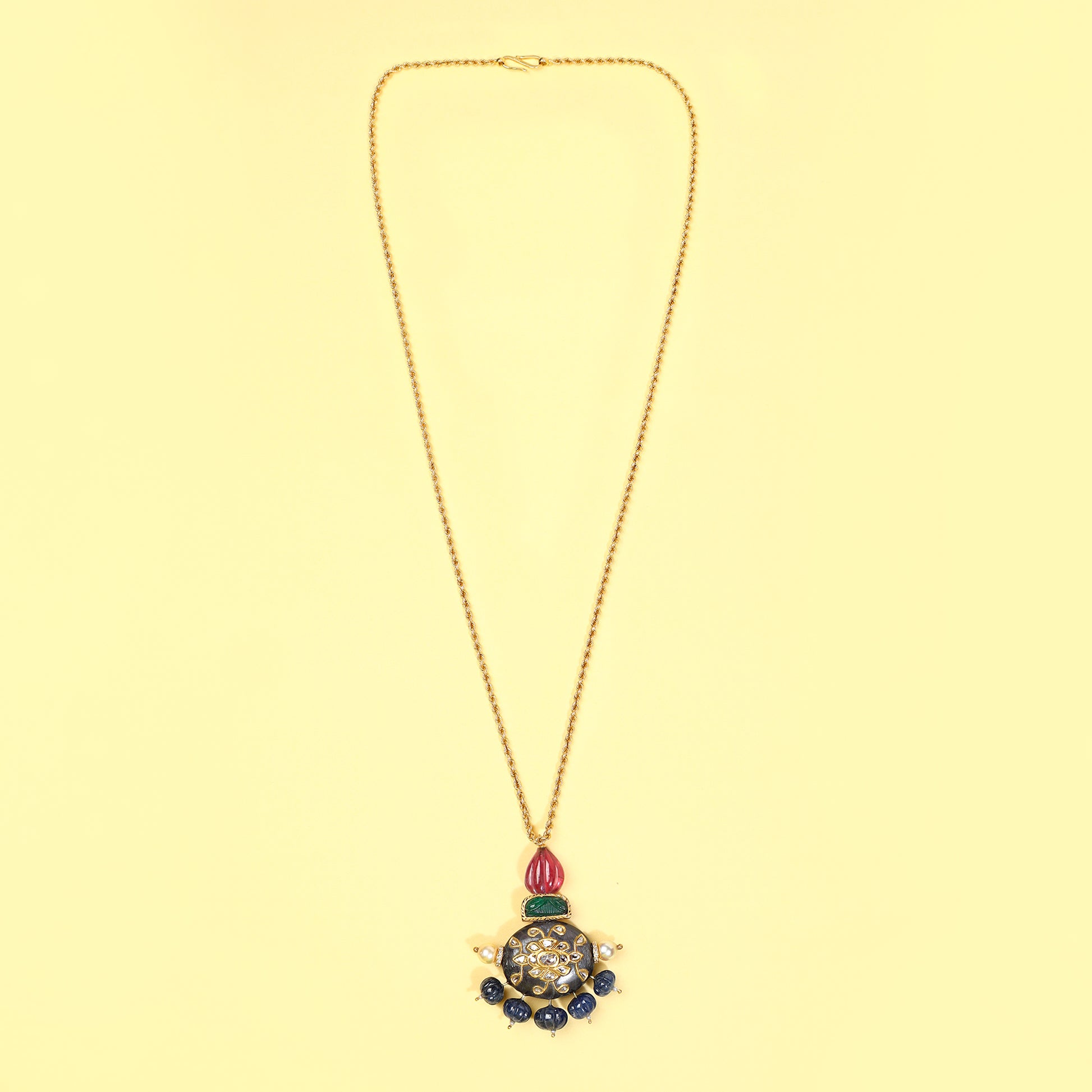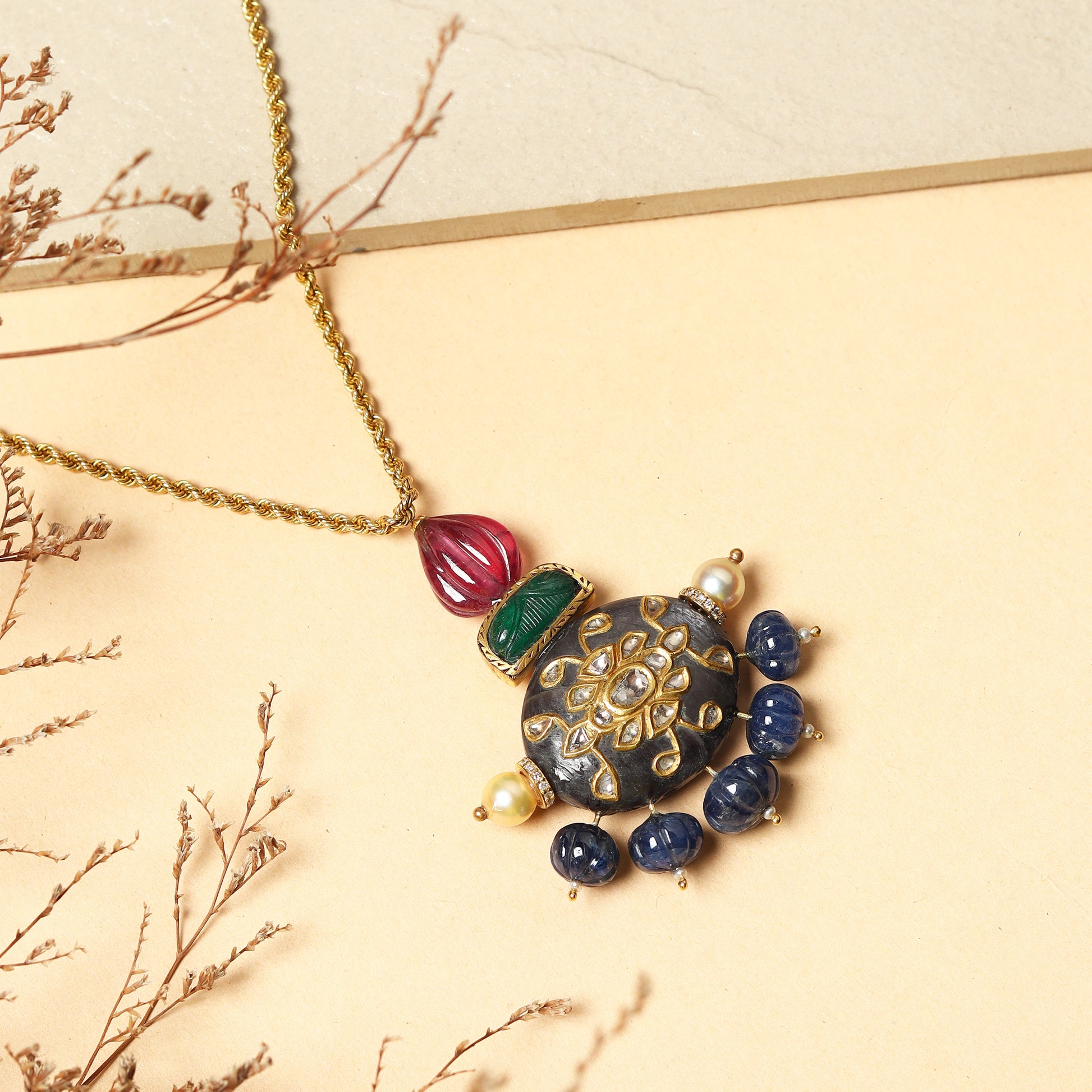 Gold 14,18 & 24 ct 5.1 gms, Polki 1.10 cts Emeralds 5.30 cts, Ruby 16.5 cts,Sapphire 36.0 cts Blackstar 78.15 cts, Pearls 6.9 cts, Diamonds 0.30 cts