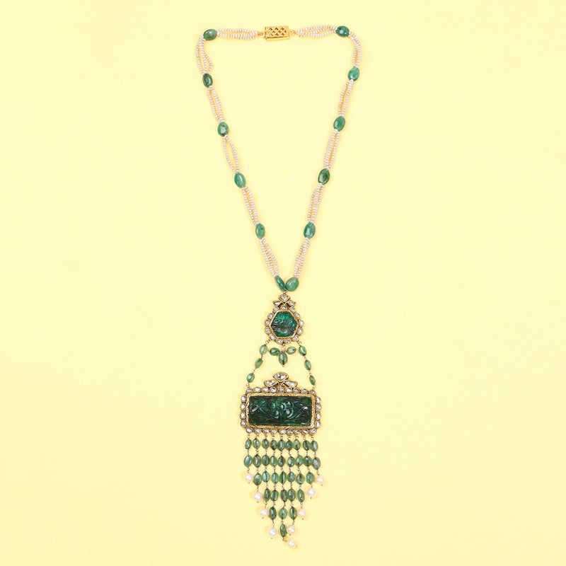 Gold 18 & 24 cts 12.8 gms, Polki 2.3 cts, Emeralds 125 cts, Pearls 65 cts