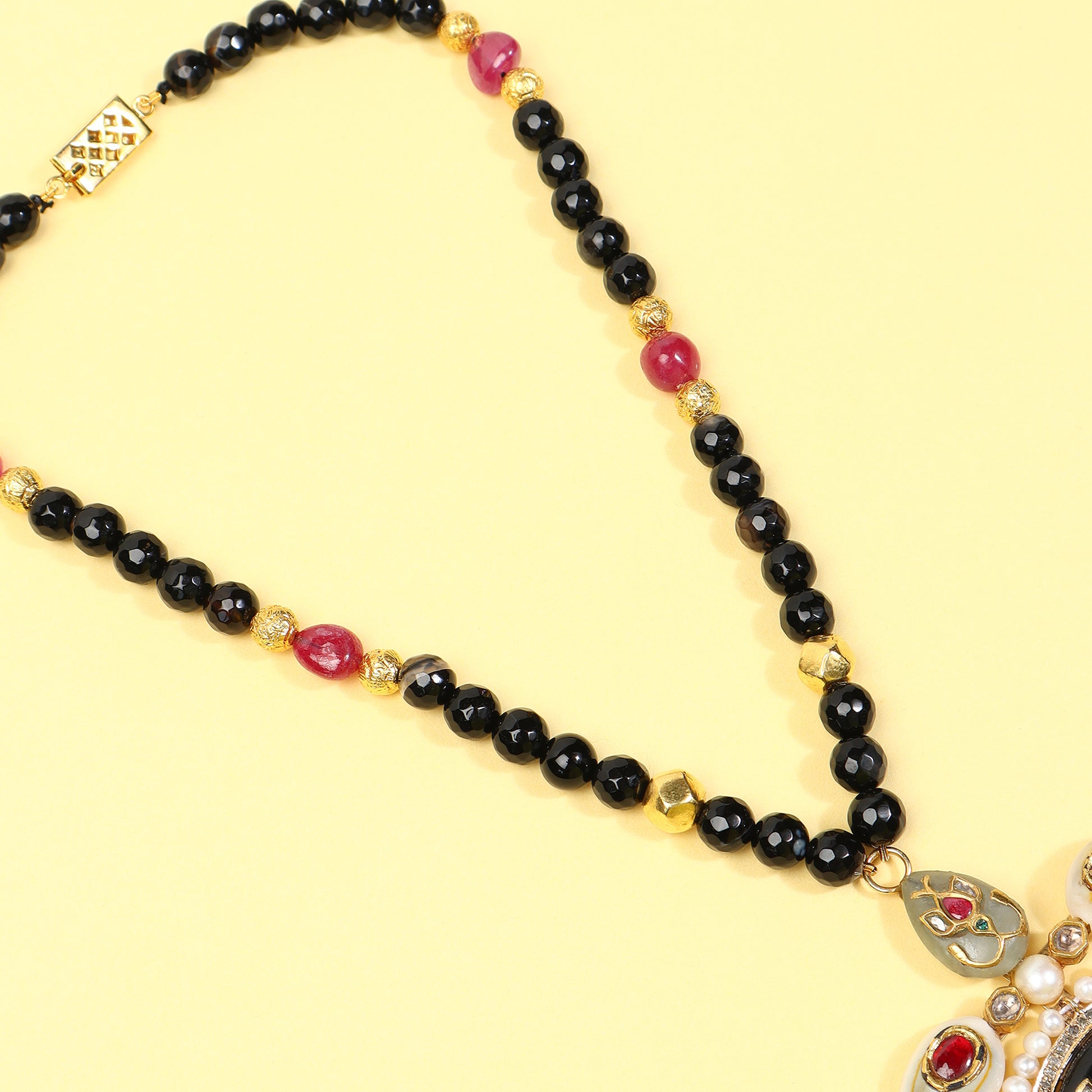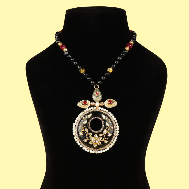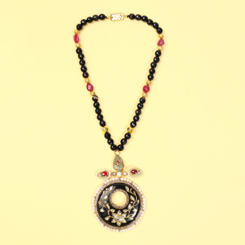 Gold 22 & 24 ct 4.0 gms, Polki 1.70 cts, Black Onyx 182 cts, Rubies 28 cts Jade 21 cts Pearls 20 cts Silver 12 gms Cowri shells 2